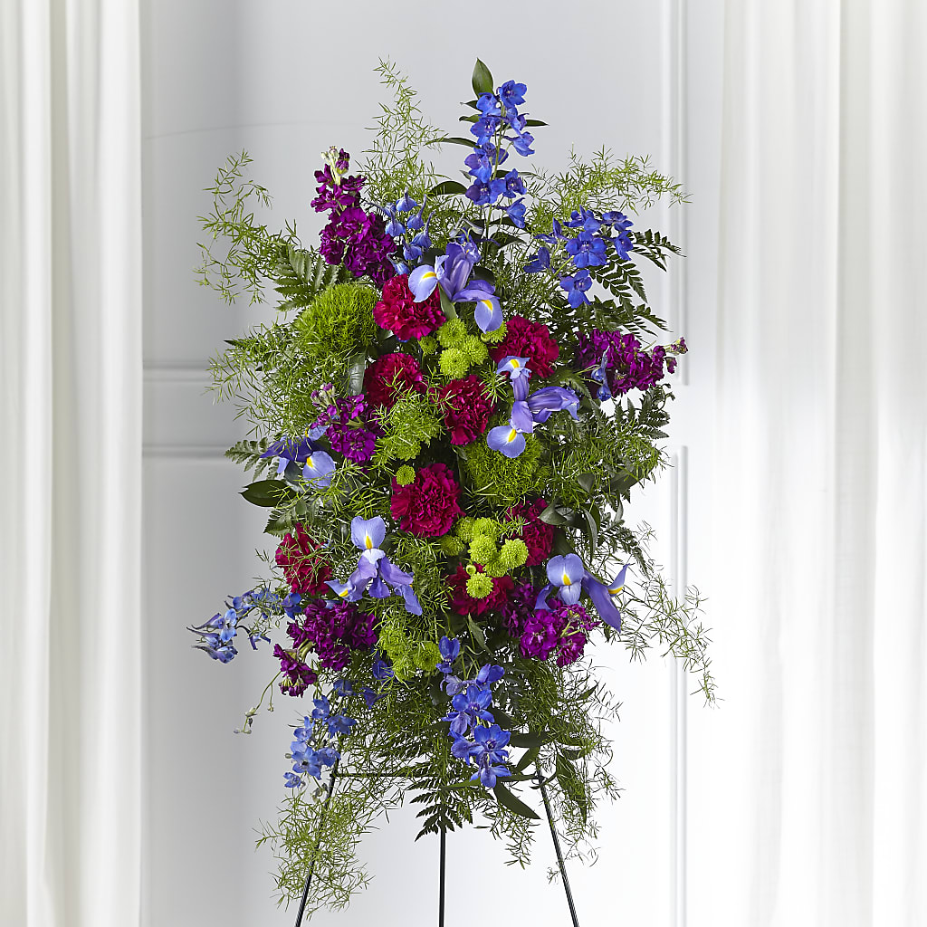 This colorful spray is a modern and refreshing mix that brings serenity to those who experience a loss. Our Heavenly Skies Standing Spray is crafted with a beautiful blend of stock, iris, dianthus and delphinium reminiscent of a hopeful wildflower garden.